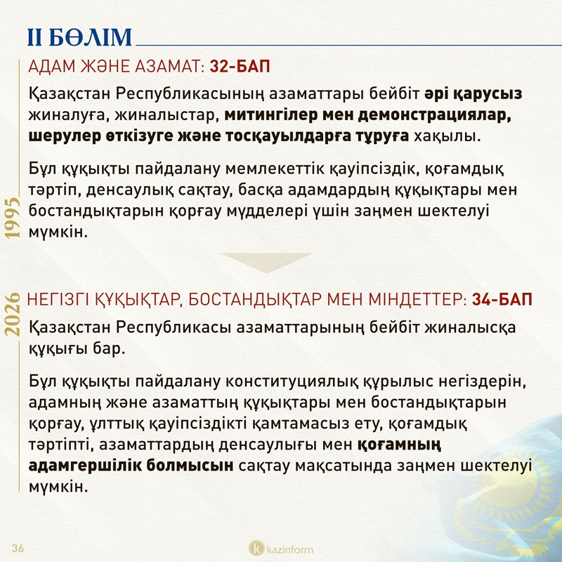 Қазақстандықтардың бейбіт жиналысқа қатысу құқығы туралы бап біраз өзгеріске ұшыраған. Нақты айтсақ, қазіргі Ата заңдағы «қарусыз жиналуға», «митингілер мен демонстрациялар, шерулер өткізуге және тосқауылдарға тұруға хақылы» деген оралымдар жаңа нұсқада жоқ. Аталған құқықты шектейтін факторлардың қатарына «қоғамның адамгершілік болмысын сақтау» дейтін тіркес қосылған.