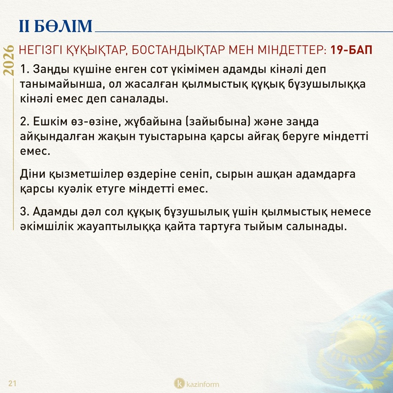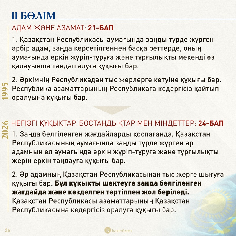 Ал 24-бапта адамның Қазақстан аумағынан шығу құқығы абсолютті еместігі көрсетілген. Қазіргі құжатта әркімнің Қазақстаннан тыс жерлерге кетуіне және қайта оралуына құқығы бар екені ғана жазылған.
