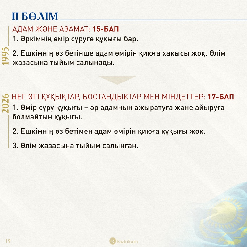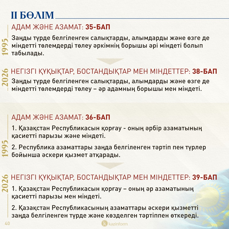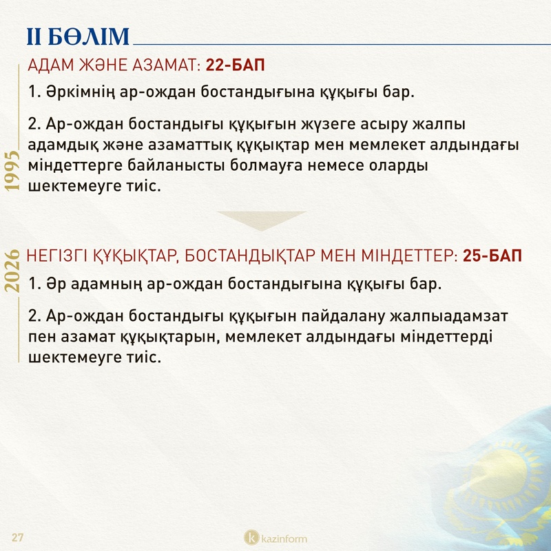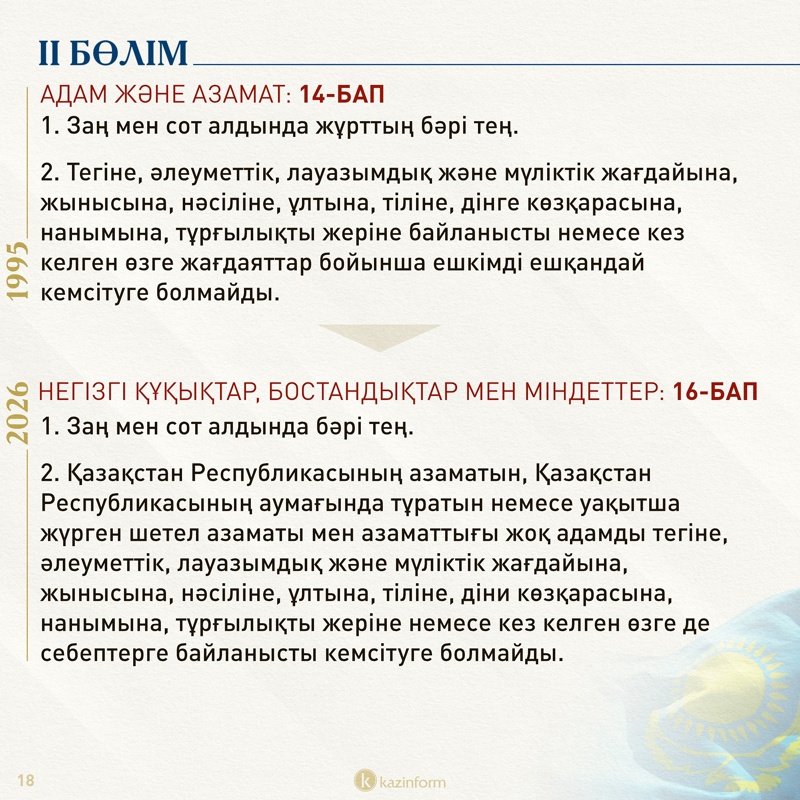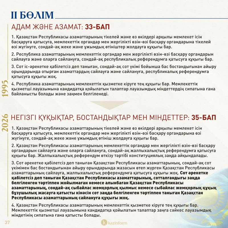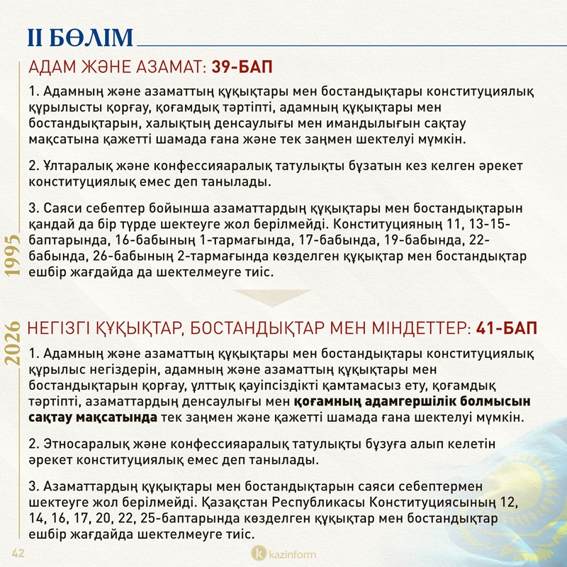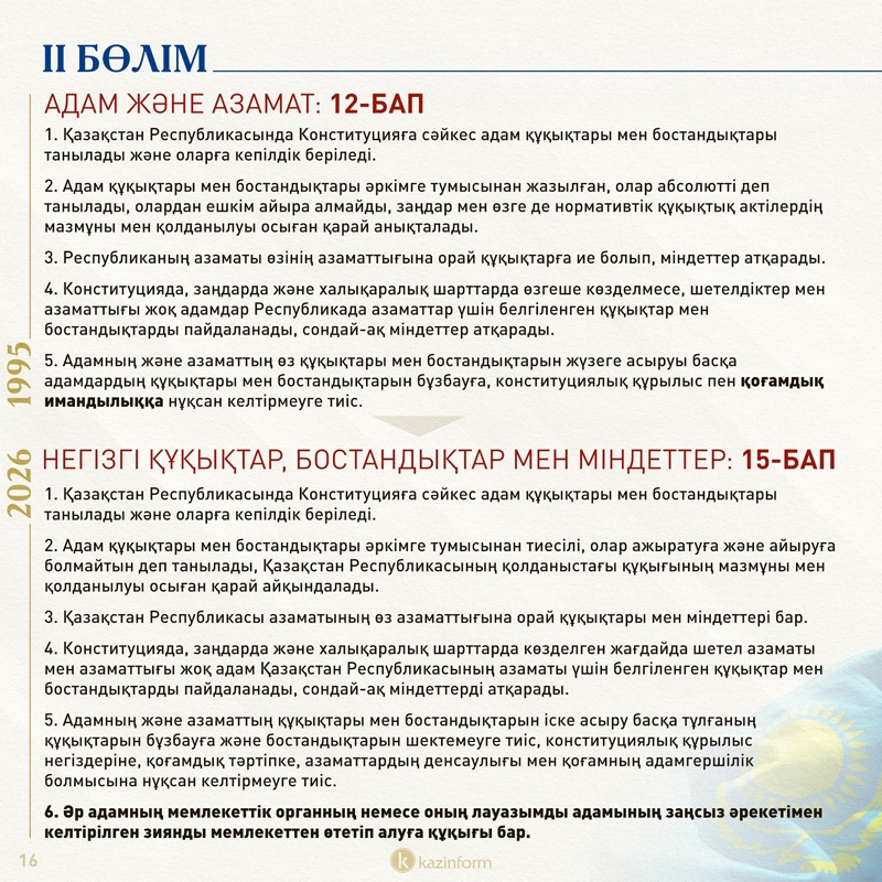 Екінші бөлім қазір «Адам және азамат» деп аталса, жаңа Конституцияда «Негізгі құқықтар, бостандықтар мен міндеттер» болып өзгерген. Жобадағы 13-баптың 3 тармағында қос азаматтықтың салдары нақтылана түскен. Ондайға жол берген адам автоматты түрде Қазақстан азаматы мәртебесінен айырылатыны айқындалған.