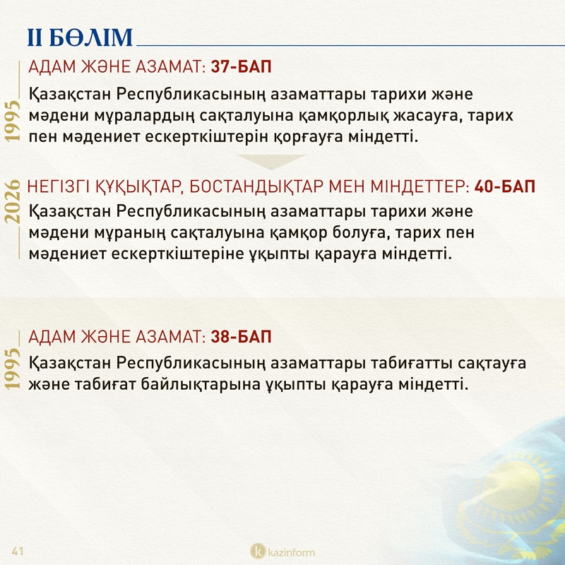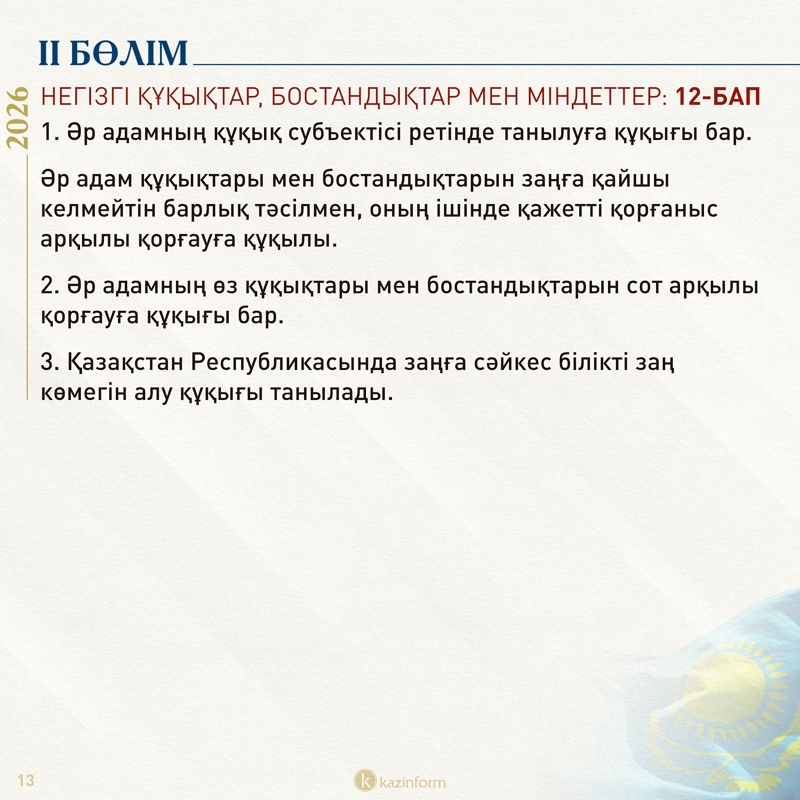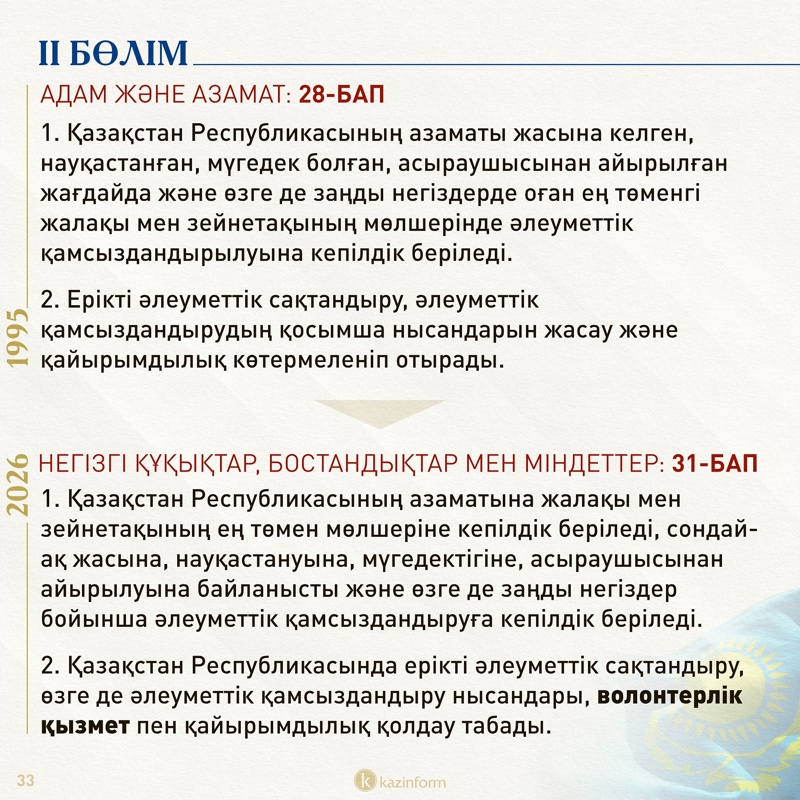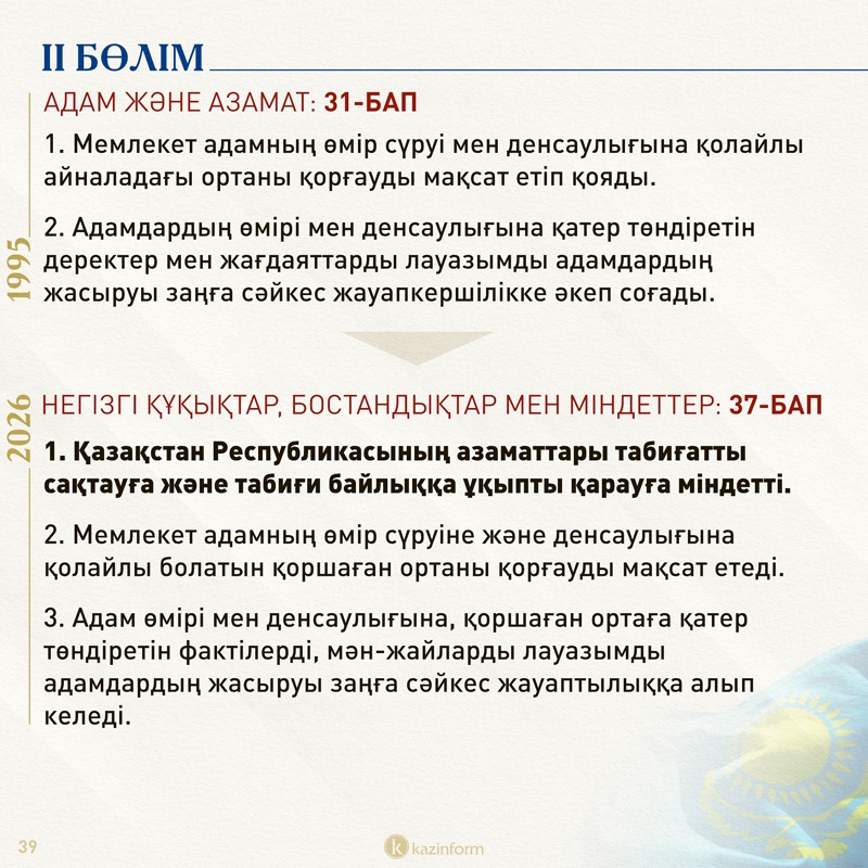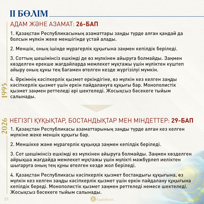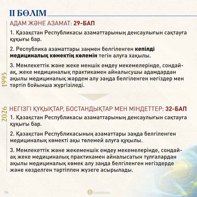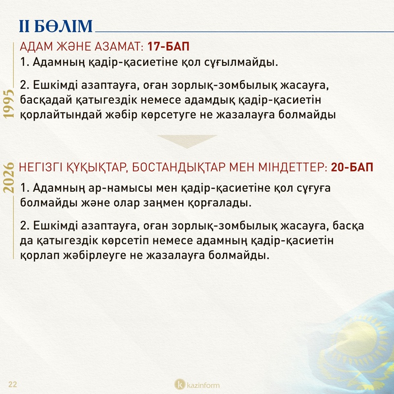 Екінші бөлім қазір «Адам және азамат» деп аталса, жаңа Конституцияда «Негізгі құқықтар, бостандықтар мен міндеттер» болып өзгерген. Жобадағы 13-баптың 3 тармағында қос азаматтықтың салдары нақтылана түскен. Ондайға жол берген адам автоматты түрде Қазақстан азаматы мәртебесінен айырылатыны айқындалған.