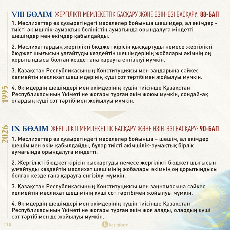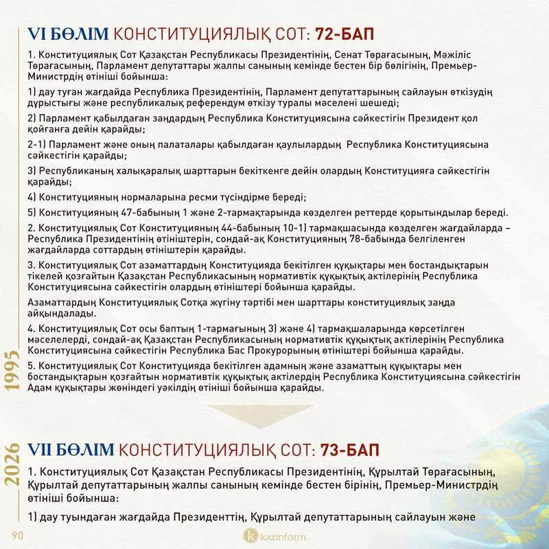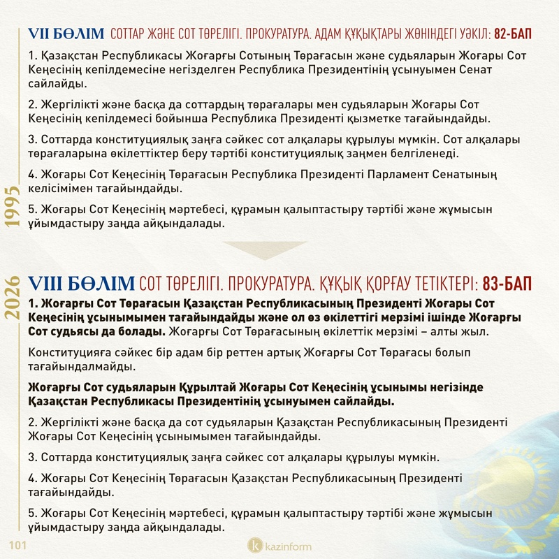Бірден айту керек, осынау жалғыз сұрақтың артында Конституцияның 96 бабы тұр. Мәтін соңында сол 96 баптың қазіргі Ата заңдағы 99 баптан айырмашылығы қандай екенін, қолданыстағы құжаттан қандай баптар түсіп, жаңа редакцияда қандай тың баптар енгізілгенін нақты көрсететін салыстырмалы кесте ұсынамыз. Әуелі соңғы жарты айдың көлемінде қатты талқыланып, eGov ресурсына түскен ұсыныстардың санын 2,5 мыңнан 10 мыңға дейін арттырған мәселелерге тоқталайық.