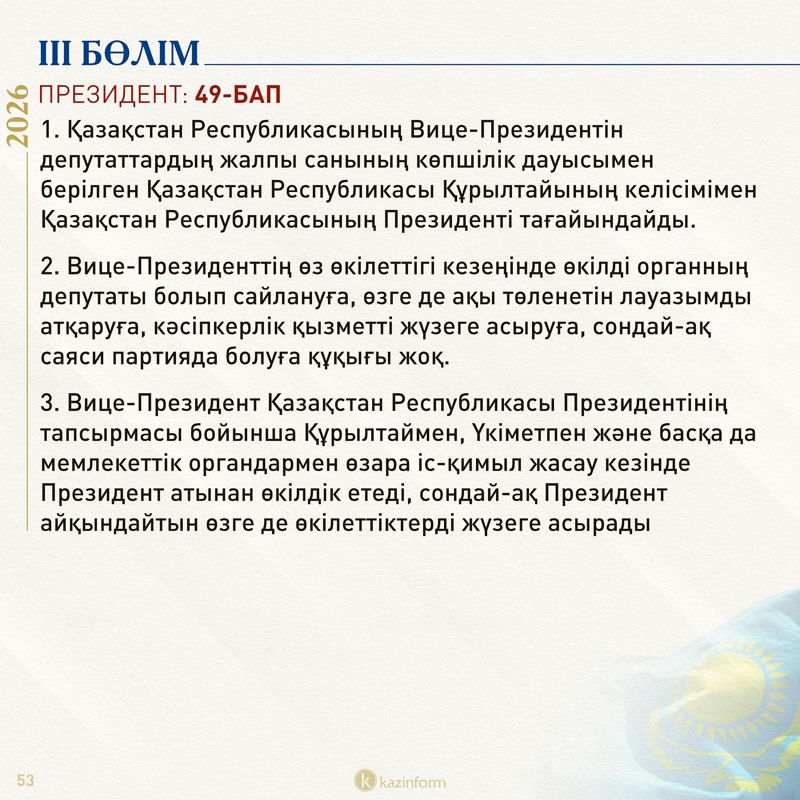 Мемлекеттік басқару жүйесіне Вице-Президент лауазымын қайтару – жаңа Конституциядағы елеулі жаңалықтың бірі. Оның құзыреті мен құқықтары туралы бірнеше бап енгізіліп отыр.