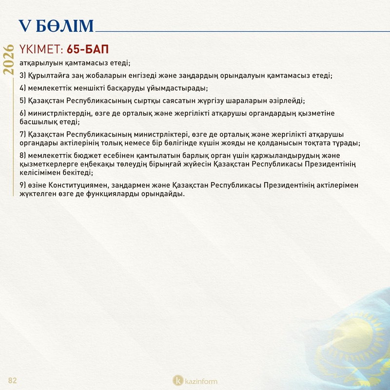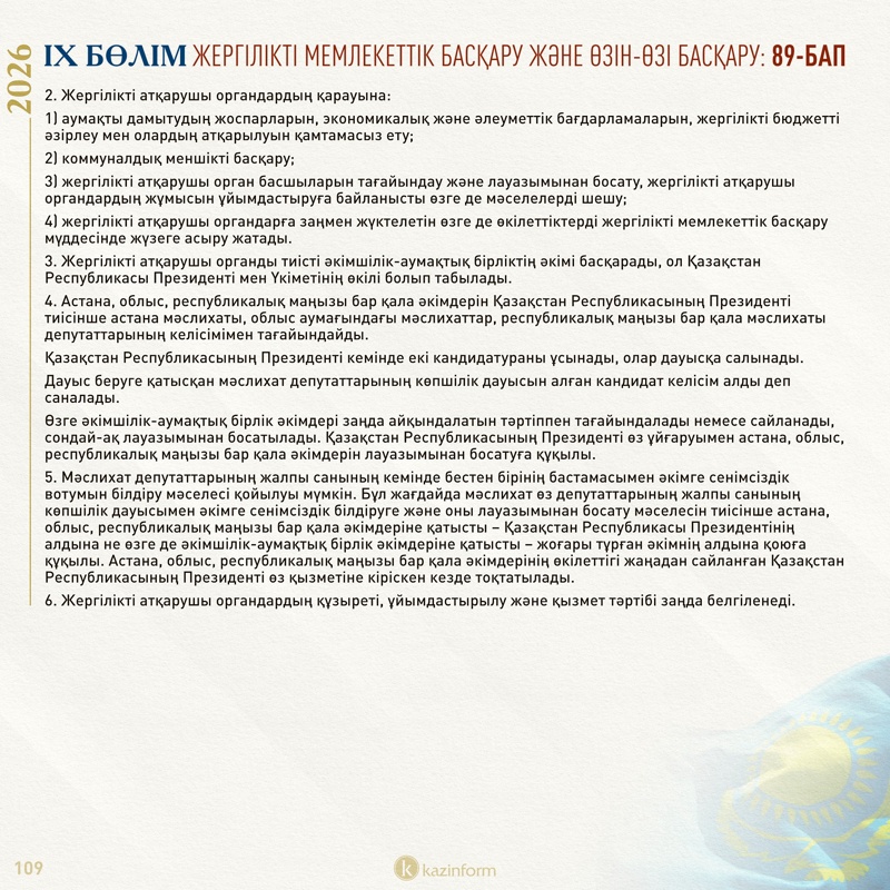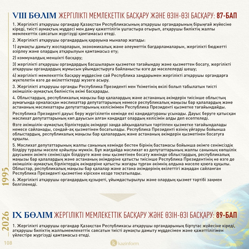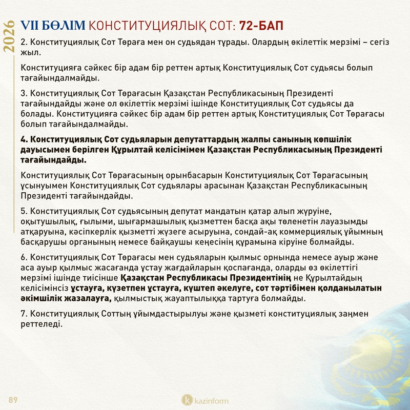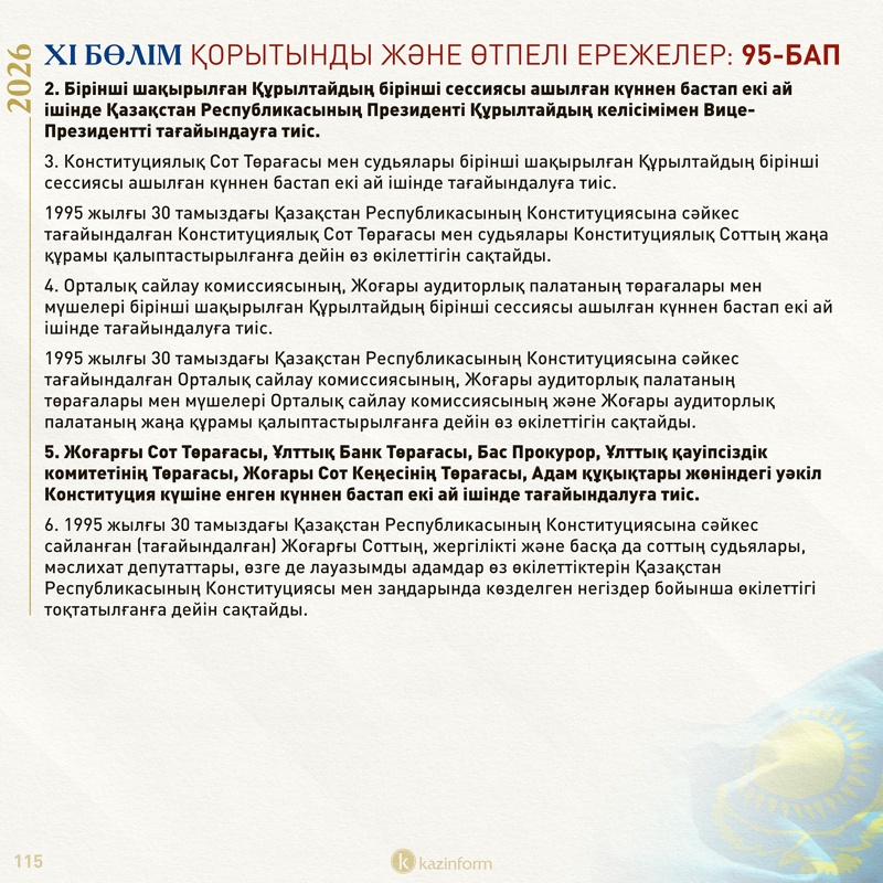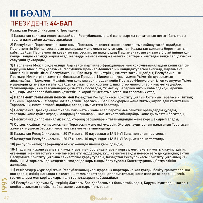 Сондай-ақ, ол Құрылтай өкілеттігі мерзімінен бұрын тоқтатылып, ол уақытша болмаған кезеңде Қазақстан конституциялық заң күші немесе заң күші бар жарлықтар шығарады.