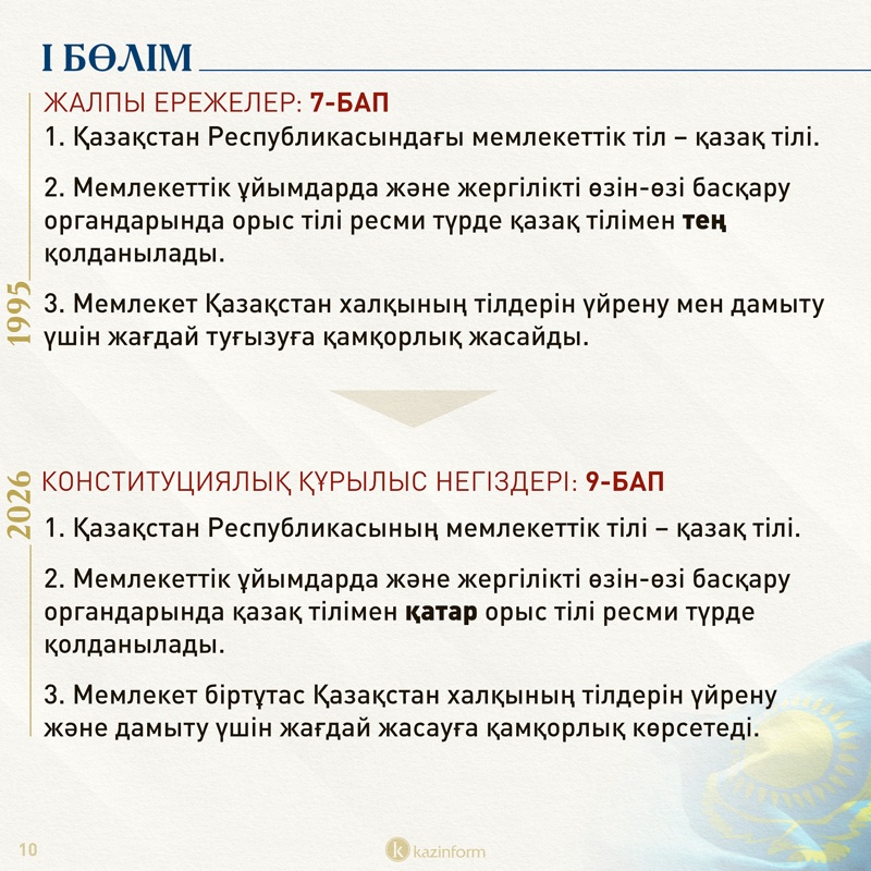 Осылайша мемлекеттік тіл туралы норма жаңа редакцияда 9-бапқа ығысқан. Мұндағы жалғыз айырмашылық – атышулы 2-тармақ ішінара өзгертілген. Қазіргі 7-баптың 2-тармағында «Мемлекеттік ұйымдарда және жергілікті өзін-өзі басқару органдарында орыс тілі ресми түрде қазақ тілімен тең қолданылады» деп келсе, жаңа нұсқада «тең» сөзі «қатар» болып жазылды.
