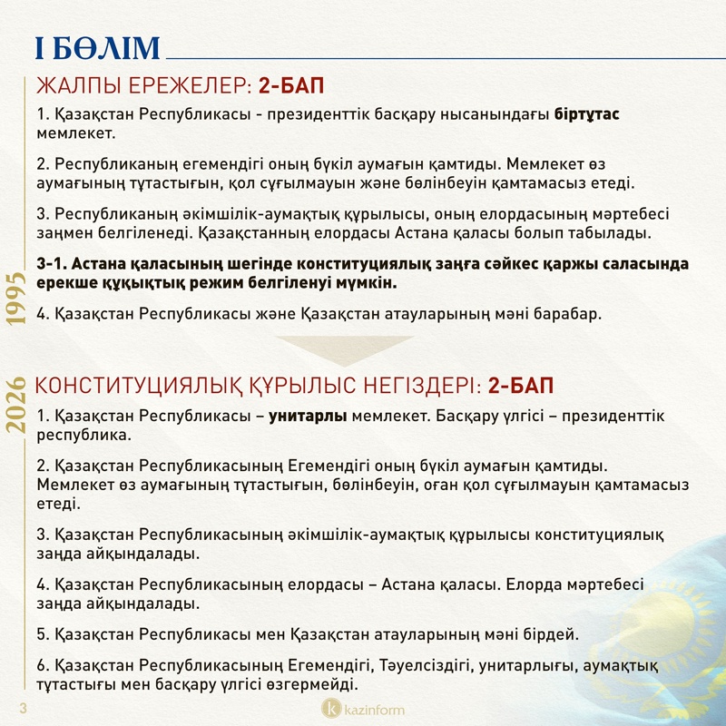 Қазіргі редакциядағы 3-1-бапта «Астана қаласының шегінде конституциялық заңға сәйкес қаржы саласында ерекше құқықтық режим белгіленуі мүмкін» деген норма бар. Жаңа редакцияда бұл норма түсіп қалған. Бірақ 5-баптың 6-тармағында жекелеген өңірлерге «қарқынды дамитын қала» атты арнаулы құқықтық режим берілуі мүмкін екені айтылған. Бұл режим қаржы саласына қатысты болғанымен, мемлекеттік басқару, сот жүйесіне де қолданылуы мүмкін екені анық жазылған.