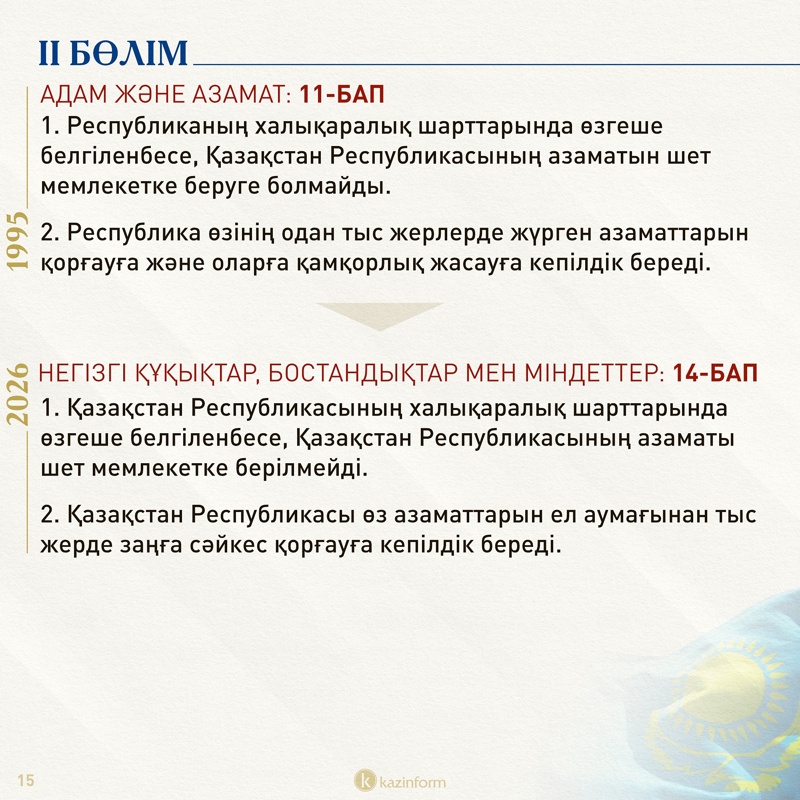 Қазіргі 11-баптың 2-тармағында ел аумағынан тыс жердегі қазақстандықтарға мемлекет қорғау және қамқорлық кепілдігін берсе, жаңа құжаттағы 14-баптың 2-тармағында қорғау мен қамқорлыққа кепілдік берілген. Жаңа редакцияда тек «қорғау кепілдігі» қалған.