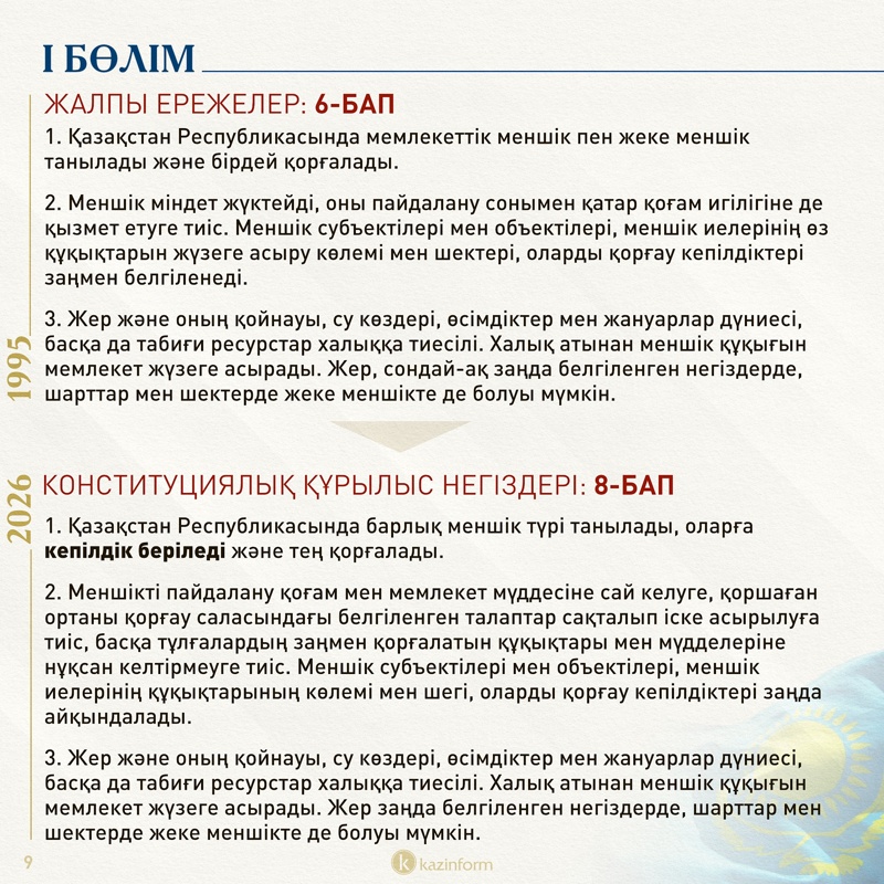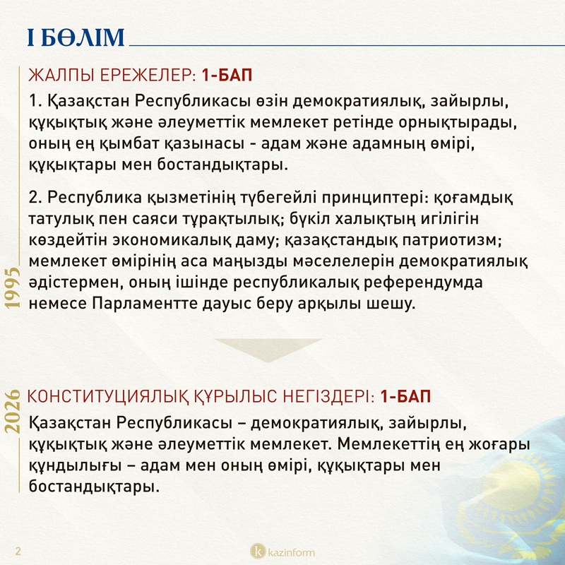 Бірінші бөлім қазіргі Ата заңда «Жалпы ережелер» деп аталса, жаңа Конституцияда «Конституциялық құрылыс негіздері» деген атау алған.