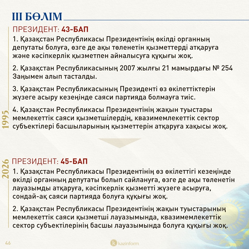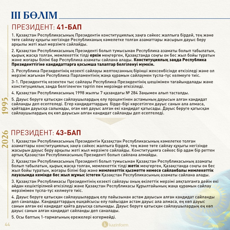 Жаңа Конституцияда Президенттікке үміткер азаматқа қойылатын талаптар қатаңдатылған. Нақты айтсақ, «мемлекеттік қызметте немесе сайланбалы мемлекеттік лауазымда кемінде бес жыл жұмыс істеу» талабы Ата заң мәтініне шығарылып отыр.