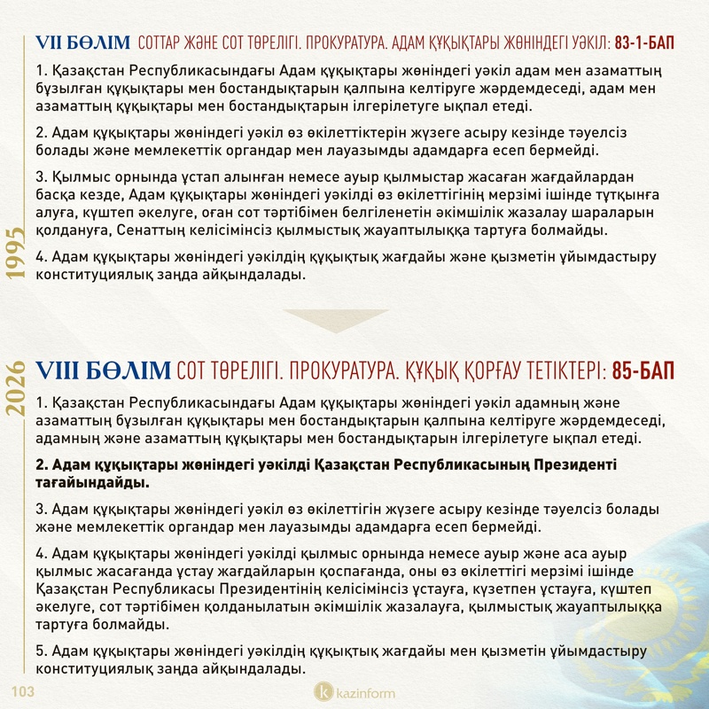 Жаңа Конституциядағы адамның білікті заң көмегін алу құқығы туралы нормада «тегін заң көмегі туралы» сөйлем алып тасталған. Қазіргі нұсқада «Заңда көзделген реттерде заң көмегі тегін көрсетіледі» деген нақтылау болған еді.