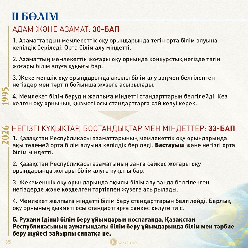 33-баптың 5-тармағында діни білім беретін мекемелерден басқа білім ұйымдарының бәрі зайырлы сипатта жұмыс істеу керектігі шегеленген.