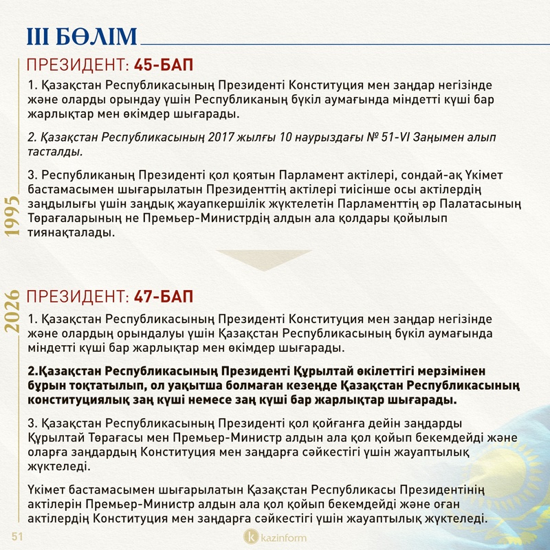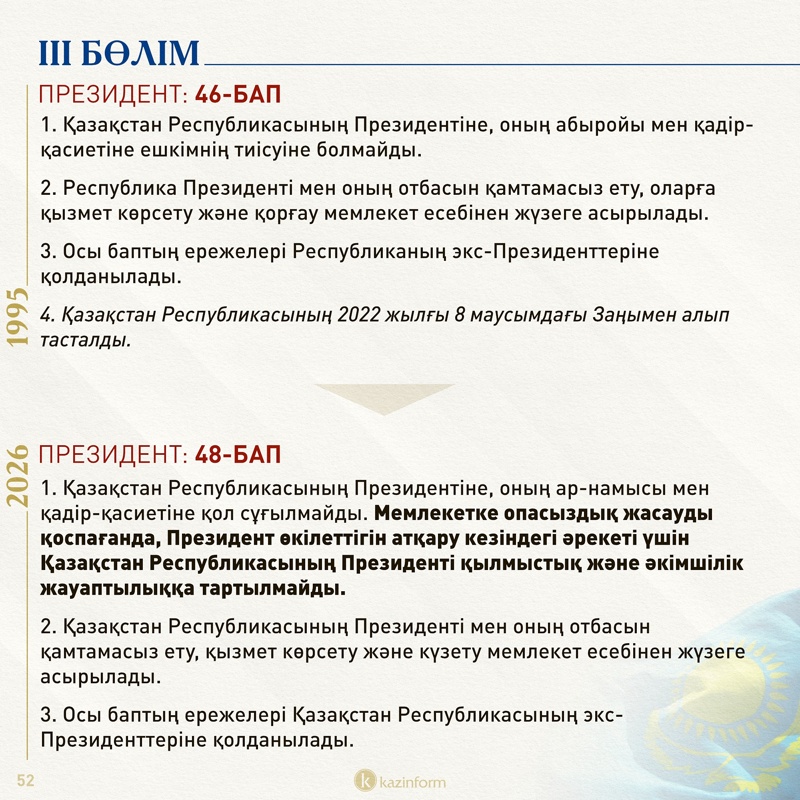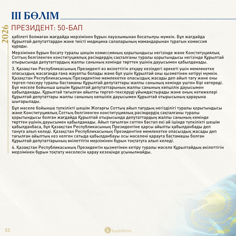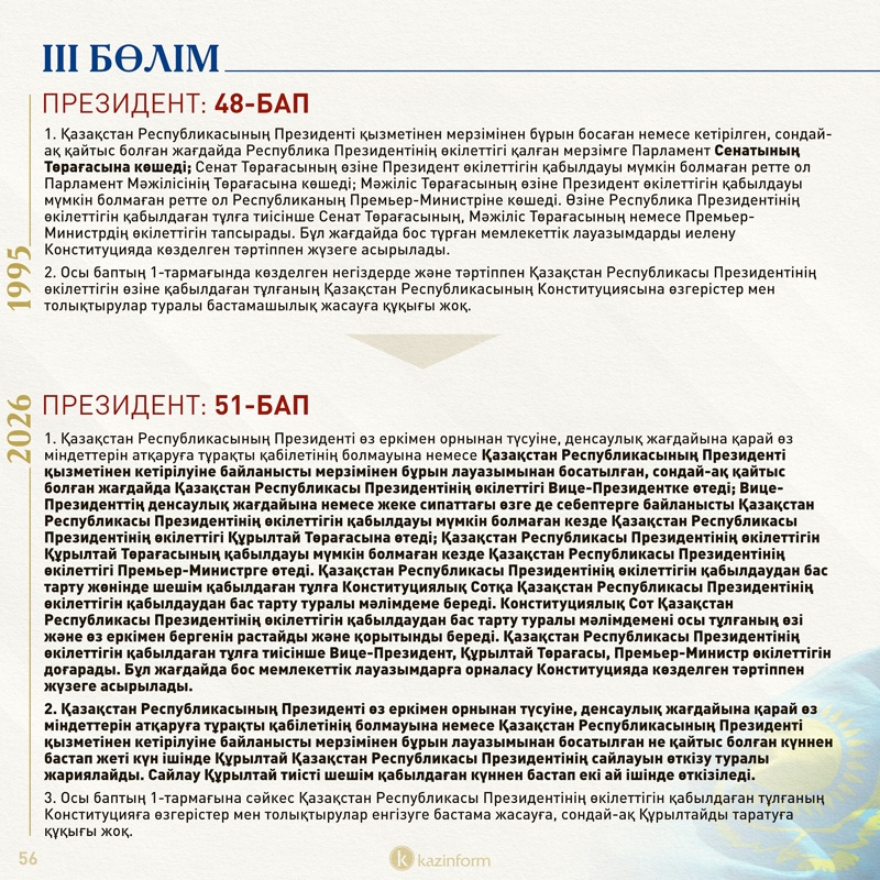 Президенттің өз еркімен, денсаулығына байланысты қызметтен кетуі, отанға опасыздық жасады деген айыппен кетірілуі туралы нормалар да ішінара нақтыланған (50, 51-баптар).