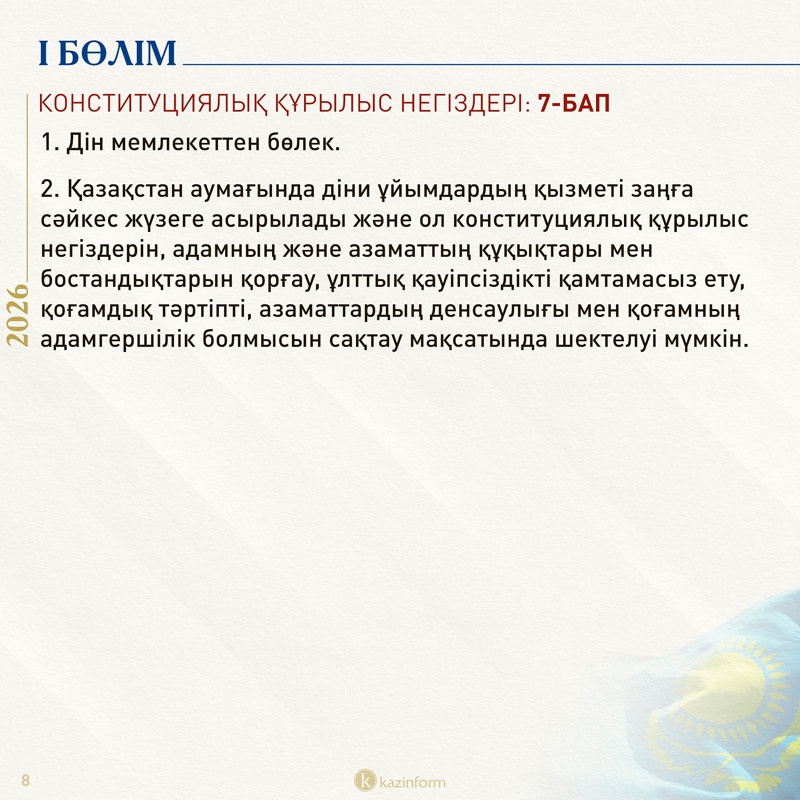 Жаңа Конституцияның 7-бабы түгелдей дінге арналған. Нақты айтсақ мемлекеттің діннен бөлек екені, адамның дін мәселесіндегі еркіндігі қандай жайттарда шектелетіні нақты көрсетілген.