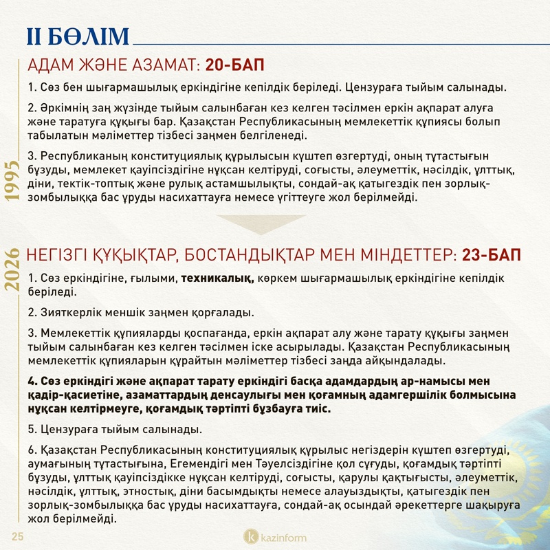 Сөз еркіндігі мен ақпарат тарату еркіндігі туралы 23-бапта бұл құқық шектелуі мүмкін екені, оған негіз болатын факторлар айқындалған.