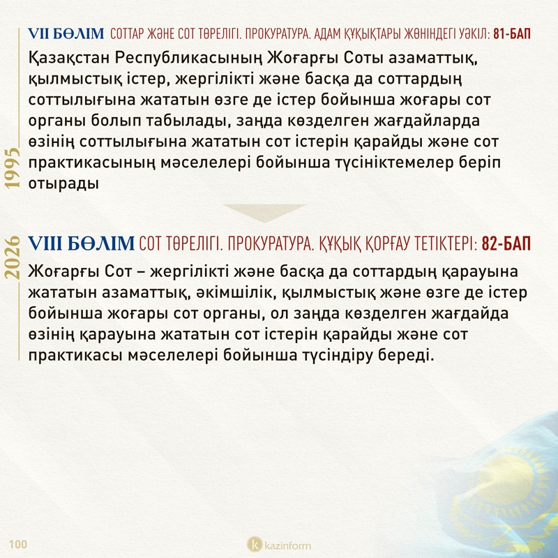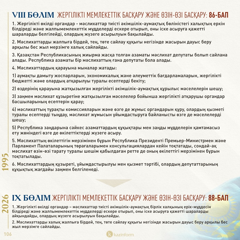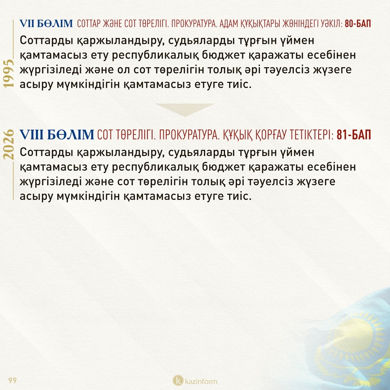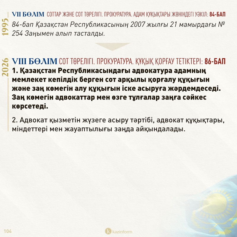 Елдегі адвокаттар қауымдастығының ұсынысымен 86-баптың 1-тармағына адвокатура институтының функциясы конституциялық норма болып енгізілді.