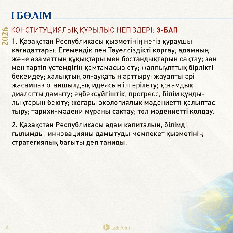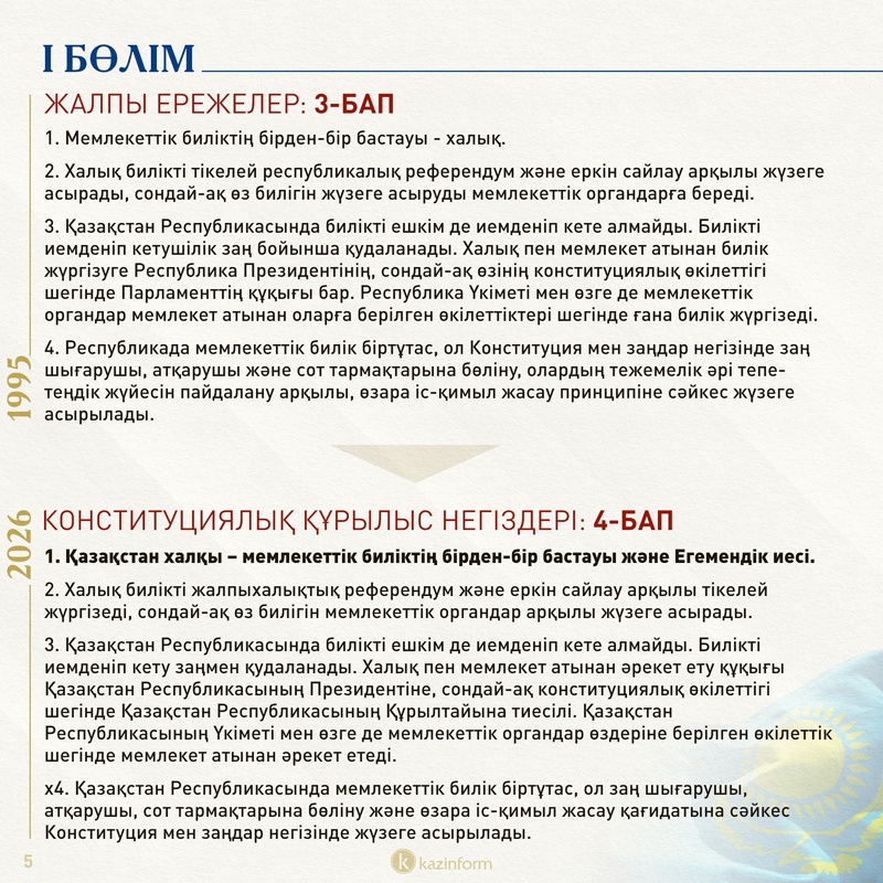 Елдегі биліктің негізгі иесі туралы норма қазіргі Конституцияның 3-бабында болса, жаңа редакцияда бұл 4-бапқа ауысқан. Қазіргі нұсқадағы «халық» сөзі «Қазақстан халқы» деп нақтыланған, билікпен қоса Егемендіктің иесі де қазақстандықтар екені көрсетілген.