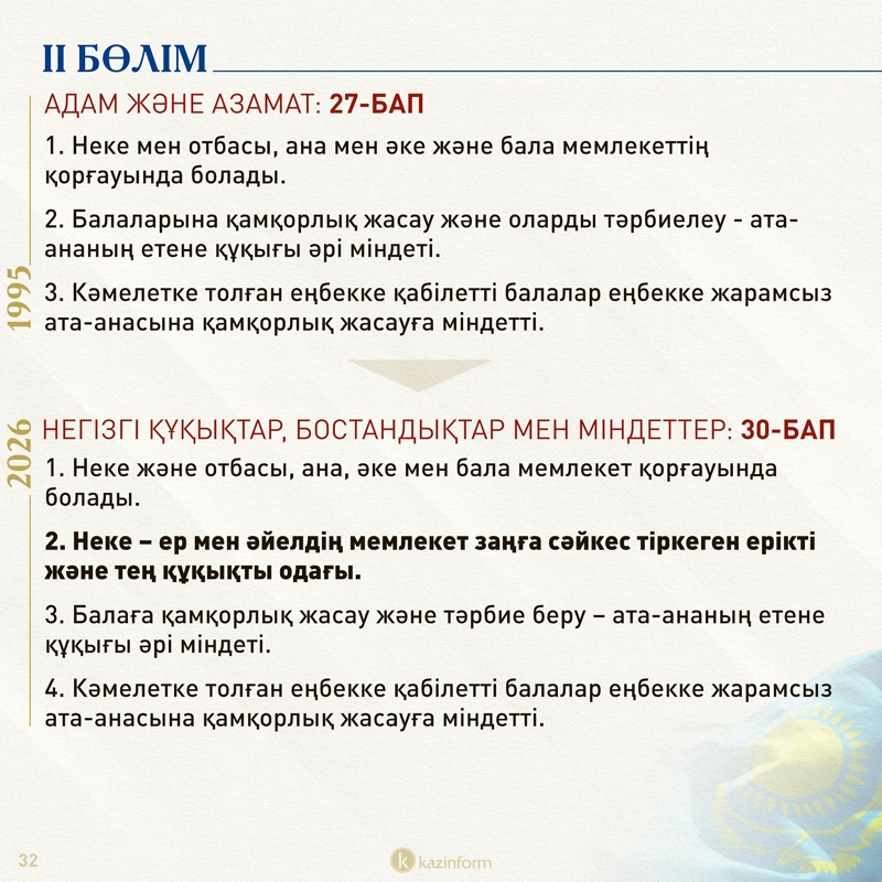 Жаңа 30-бапқа «неке – ер мен әйелдің мемлекет заңға сәйкес тіркеген ерікті және тең құқықты одағы» екені туралы тармақ енгізілді.