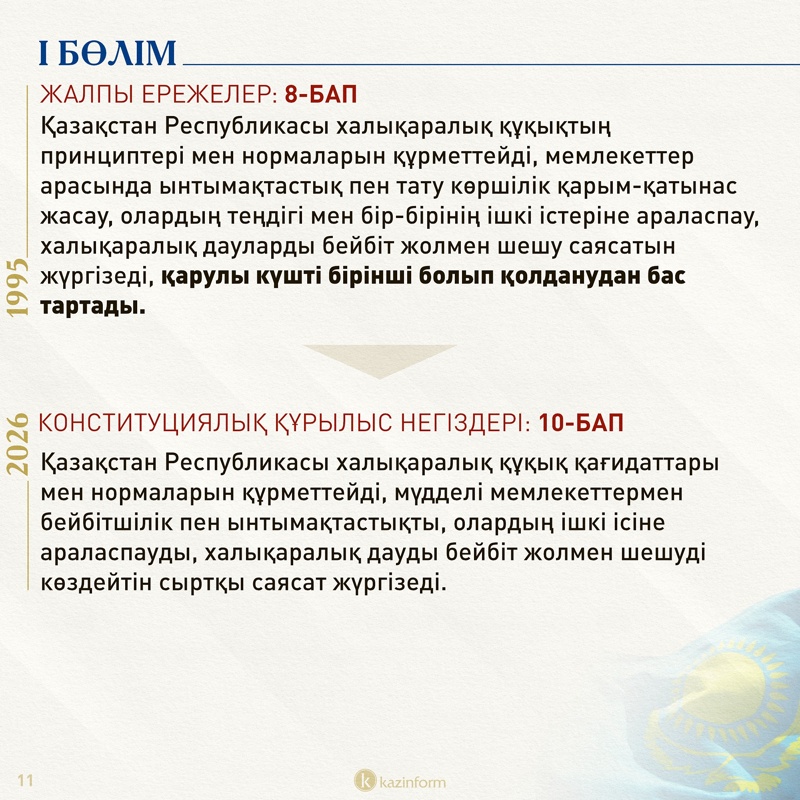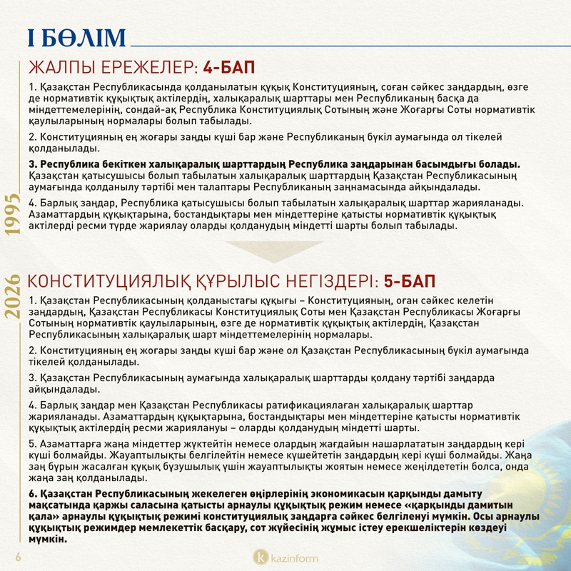 Қолданыстағы 4-баптың 3-тармағында ел аумағында күші бар деп танылған халықаралық шарттар Қазақстан заңдарынан басым деп көрсетілген. Ал жаңа Конституциядағы 5-баптың 3-тармағында бұл норма екіұштыланып, халықаралық шарттарды қолдану тәртібі заңдарда айқындалатыны ескертілген.