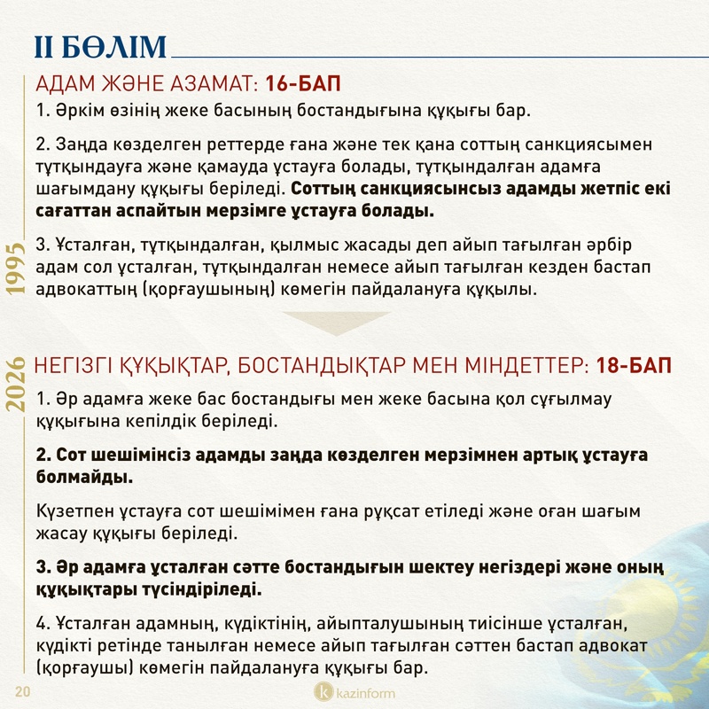 Ал қандай да бір заң бұзу күдігіне ілінген адамды сот шешімінсіз ұстау мерзімі екіұштыланып, «заңда көзделген мерзімнен артық ұстауға болмайды» деп жазылған. Қазіргі нұсқада 72 сағаттан аспау керектігі нақты айтылып тұр. Жаңа Конституцияның ең прогрессивті нормаларының бірі ретінде көп насихатталған Миранда қағидаты осы 18-бапқа енген.