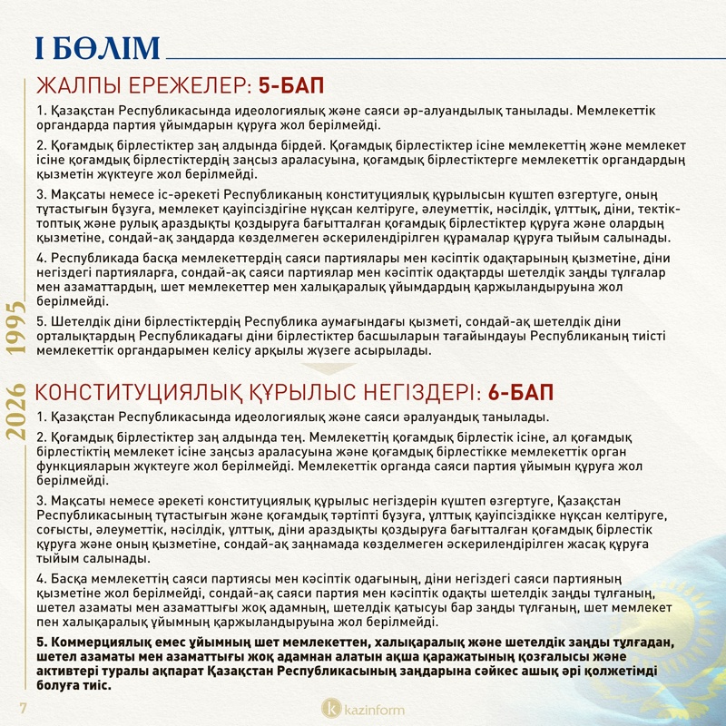 Адамның ұлттық және діни ұстанымын көрсетпеу құқығы туралы нормадан партиялық ұстаным туралы тұсы алып тасталған. Қазіргі Конституцияда азаматтар қай партияға мүше екенін де айтпауға құқылы болатын.