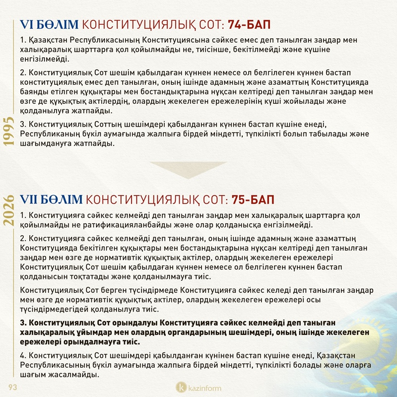 VІІ бөлімнің 75-бабы 3-тармағында Конституциялық сот халықаралық ұйымдар мен олардың органдардың шешімдері мен жекелеген ережелерін Ата заңға сәйкес келмейді деп таныса, Қазақстан аумағында орындалмайтыны көрсетілген.