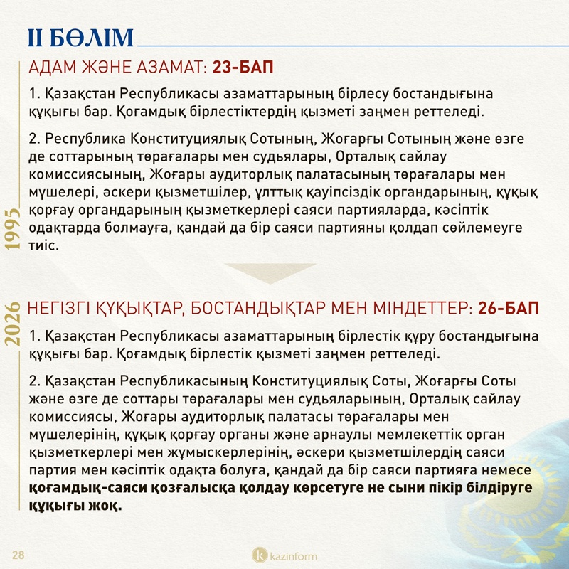 Саяси партиялар мен кәсіподақ құрамында болуға құқығы жоқ лауазым иелері туралы бап жаңа оралымдармен толығып, сот билігі өкілдері мен құқық қорғау қызметкерлерінің, әскерилердің қоғамдық-саяси қозғалысқа қолдау көрсетуге не сыни пікір білдіруге құқығы жоқ екені ашып жазылған.