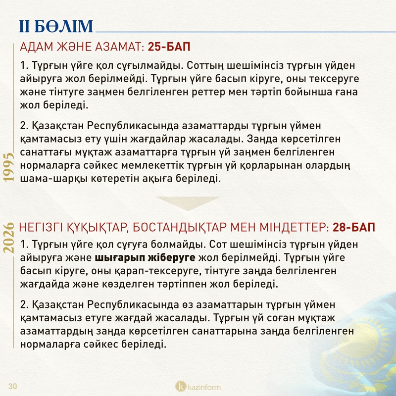 Тұрғын үйге қол сұғылмау құқығы туралы бапқа баспанадан «шығарып жіберуге жол берілмейтіні» қосылған.