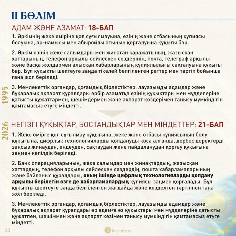 21-баптағы жеке өмірге қол сұғылмау құқығы цифрлық ортадағы дербес деректерді қамтитыны қосылған.