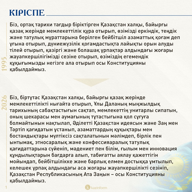 Қазіргі Конституцияның преамбуласы мемлекеттілігін енді ғана қалпына келтіріп, болашаққа үлкен үмітпен қадам басқалы отырған халықтың атынан айтылғандай әсер қалдырса, жаңа редакциядағы кіріспе мемлекеттілігі толық қалыптасқан, өткенін бағамдап, болашағын нақты айқындаған елдің негізгі құжаты екенінен хабар беріп тұр. Кіріспе мәтініндегі «мемлекеттілікті нығайта отырып», «Ұлы Даланың мыңжылдық тарихының сабақтастығын сақтап», «Әділетті Қазақстан идеясын және Заң мен Тәртіп қағидатын ұстанып» деген оралымдар – соның мысалы.