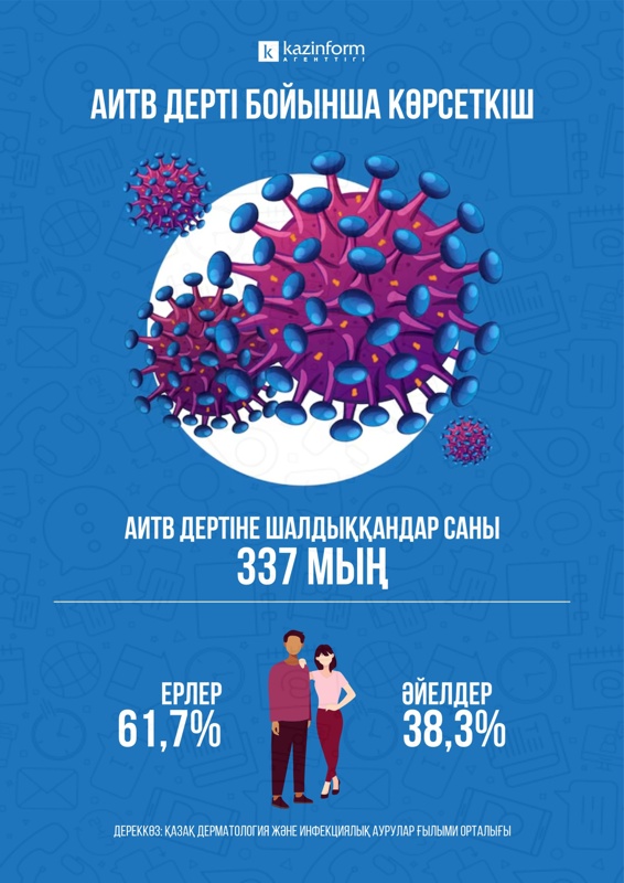 Қазақ дерматология және инфекциялық аурулар ғылыми орталығының мәліметінше, Қазақстанда АИТВ-мен өмір сүретін шамамен 37 мың адам тіркелген. Олардың ішінде 61,7%-ы ерлер болса, 38,3%-ы — әйелдер.