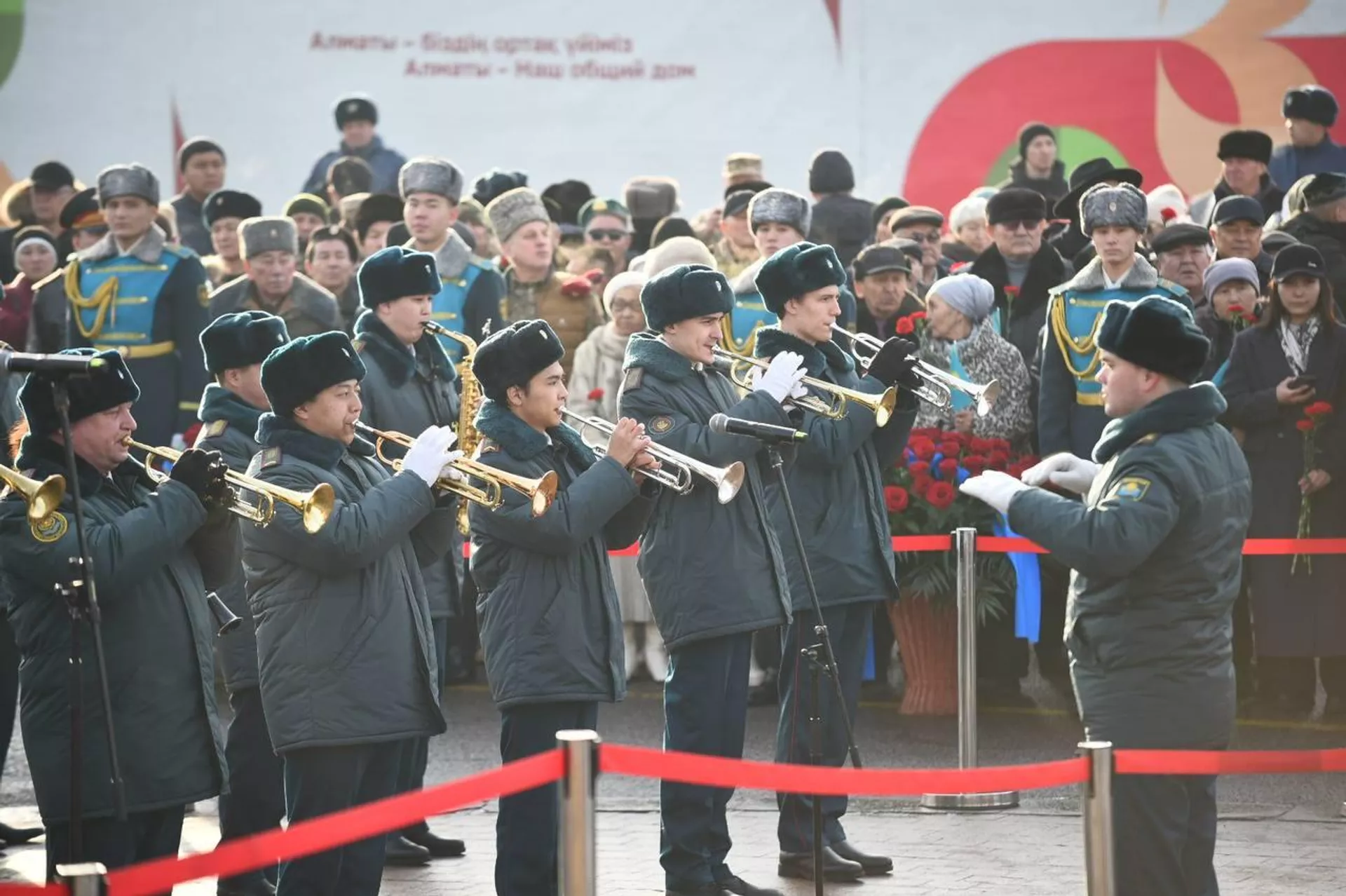 Қалың қауым ішінде ардагерлер, қоғам қайраткерлері, әскерилер, депутаттар бар. Алматы әкімі Дархан Сатыбалды да гүл шоқтарын қою рәсіміне қатысты.