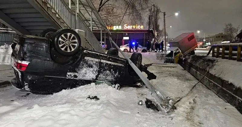 Ал Toyota Land Cruiser жолдан шығып кетіп, электр желісінің тіреу бағанасын және жарық шамы бағанасын қағып, тротуарда төңкеріліп қалған.