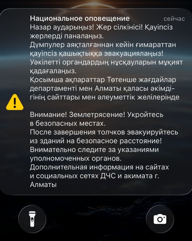 Шұғыл! Алматылықтардың телефонына жер сілкінісі туралы хабарлама түсіп жатыр