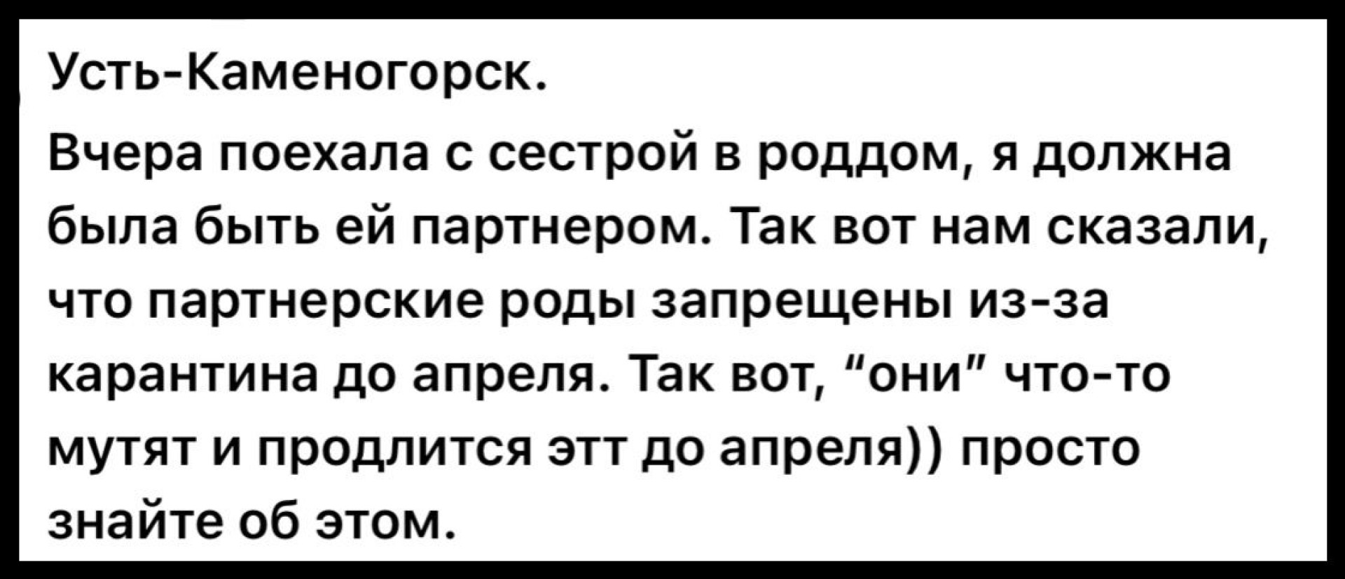 Әлеуметтік желілерде Өскемен тұрғынының жазбасы тарады. Ол перзентханада әпкесі босануға кірген кезде бірге кіре алмағанн айтқан. Оны сөзінше, қызметкерлер "2026 жылдың сәуіріне дейін карантин" екенін алға тартқан. Пост желіде тез таралып, болашақ ата-аналар арасында түрлі пікір тудырды.