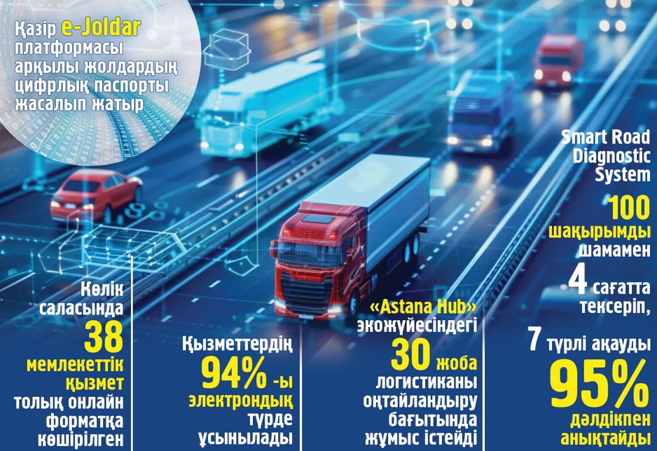 Қазір e-Joldar платформасы арқылы жолдардың цифрлық паспорты жасалып жатыр. Жасанды интеллектіге негізделген Smart Road Diagnostic System жүз шақырымды шамамен төрт сағатта тексеріп, жеті түрлі ақауды 95 пайыз дәлдікпен анықтайды. Ауыр жүктемені бақылауға автоматтандырылған өлшеу стансалары орнатылып жатыр, оның он шақтысы іске қосылды. Мұндай бақылау жол жабынының мерзімін ұзартып, жөндеу шығынын азайтады.