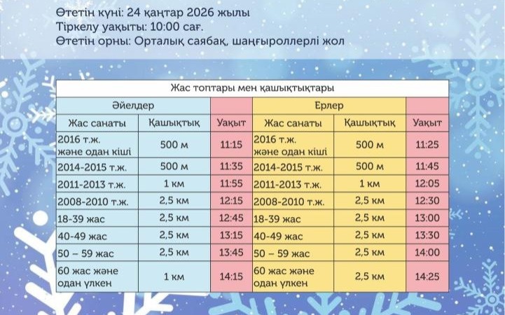 — Бұл жарыс дәстүрлі спорттық шараға айналды. Негізгі бәсеке — шаңғы жарысы. Ол 16 жас ерекшелік санаты бойынша қыздар мен ұлдар арасында өткізіледі. Қашықтықтар 500 метрден бастап 1 және 2,5 шақырымға дейін белгіленген. Қатысушыларды тіркеу сағат 10:00–де басталып, жалпы старт 11:00–де беріледі. Барлық жарыстарға қатысу тегін. Барша тұрғындарды салауатты өмір салтын ұстануға шақырамыз, — деді қалалық спорттық іс-шараларды өткізу дирекциясы басшысының орынбасары Ержігіт Өсербай.