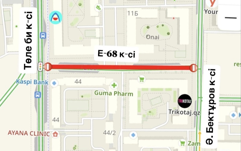 5 сәуірден бастап маусым айына дейін Е68 көшесінің Ә. Бектұров көшесінен Төле би көшесіне дейінгі учаскесінде құрылыс жұмыстары басталады, автокөлік қозғалысы толық жабылады.