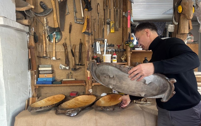 - Қолмен жасаған бұйым қашанда құнды ғой, мұндай жұмысқа жан кіреді. Желімдеп жасалған астау ұзаққа бармайды, бәрібір бір күні жарылады. Ал ағаш — жылы, тірі материал. Ол үнемі «қозғалыста» болады. Негізі, кез келген материалда бұл қасиет бар, тіпті металдың өзі де ойнайды. Сондықтан астауды тұтас бір ағаштан ойып жасау қажет, - дейді Болатбек Қалдыров.