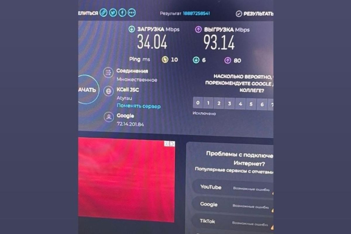 Алайда Атыраудағы бір мектепте жүргізілген өлшеу: жүктеу жылдамдығы — 34,04 Мбит/с, шығару жылдамдығы — 93,14 Мбит/с, пинг — 10 мс екенін көрсетті. Яғни деректерді қабылдау жылдамдығы көрсетілген деңгейден едәуір төмен болып шықты.