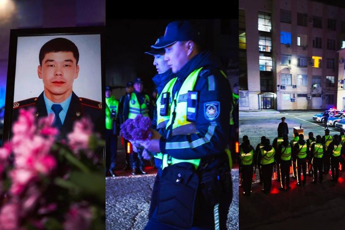 Атырауда патрульдік полиция батальонының қызметкерлері батыр әріптестерінің суретіне гүл шоқтарын қойып, оның ерлігін ілтипатпен еске алды.