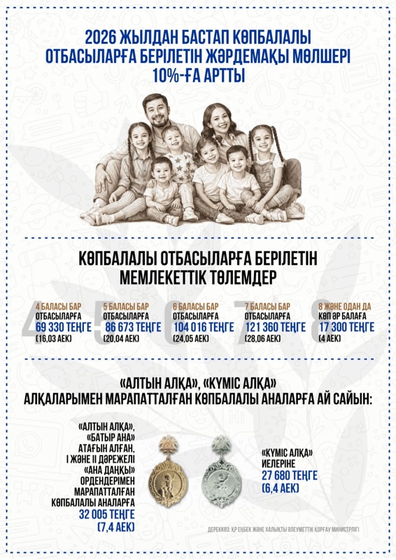 Осы орайда 2026 жылы айлық есептік көрсеткіш (АЕК) мөлшерінің артуына байланысты көпбалалы аналарға төленетін ай сайынғы жәрдемақы көлемі де артқанын айта кету керек.