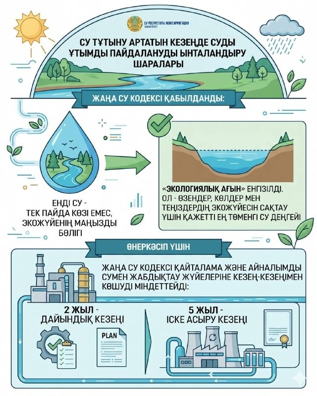 Су нысандарының сарқылуын болдырмау мақсатында «экологиялық ағын» ұғымы енгізілді. Бұл - өзендер, көлдер мен теңіздердің экожүйесін сақтау үшін қажетті судың ең төменгі рұқсат етілген деңгейі. Өнеркәсіп кәсіпорындары үшін жаңа Су кодексі 7 жыл ішінде қайталама және айналымды сумен жабдықтау жүйелеріне кезең-кезеңімен көшу талаптарын бекітті. Оның ішінде 2 жыл дайындық кезеңіне, ал 5 жыл жоспарларды іске асыруға беріледі.
