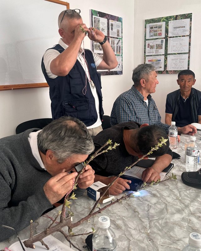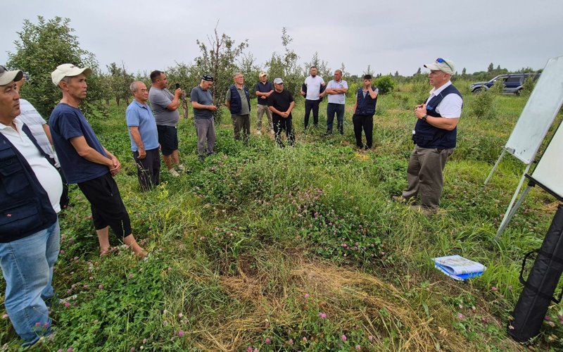 Сабақтар егіс алқаптарында өтті. Қатысушылар феромонды тұзақтарды орнатуды, бүріккіштерді дәл баптауды, биологиялық препараттарды дұрыс қолдануды және зиян шегінің экономикалық деңгейін есептеуді үйренді.