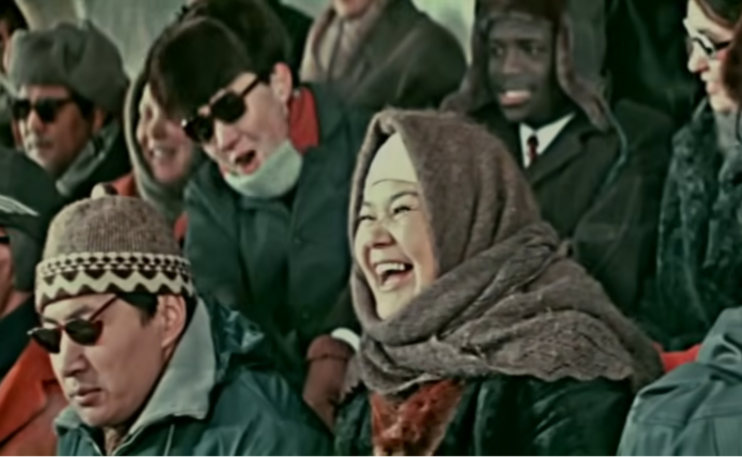 Режиссер осындай сансыз кадр кезектесе алмасқан тұста күннің суықтығынан мұздап, қалтадағы шақпағын жақпай ерніне қыстырған темекіні екіншісінің аузындағы темекімен тұтатып тұрған көзілдірікті шетелдіктерге бұра қояды. Яғни Шәкен Айманов көпшілік сахнадағы ерінде қыстырған шылымды ауыздағы темекімен тұтатқан азаматтардың әрекетінен күлкі тудырып, мұның сыртына жанкүйерлердің шуын қосып, көкейіндегі сөзді айтуға ыңғайланғанын көреміз. Сонда не айтты дерсіз? Егде жастағы шетелдік басын шайқап күле отырып: «Орыс қысы суық екен?» деп томардай етіп, тосын ойды ортаға тастап кеп жібереді. Оған іле екіншісі «Қазақтың қысы» деңіз деп жауап беріп, миллиондардың көкейіндегі сөзді сауырдан ұрған қамшыдай сарт еткізеді. Ал қолын ысқылап жаураған шетелдік: «О, иә, иә! Қазақтың қысы» деп әлгінің уәжіне бас шұлғи келісіп, қарқылдап күледі.