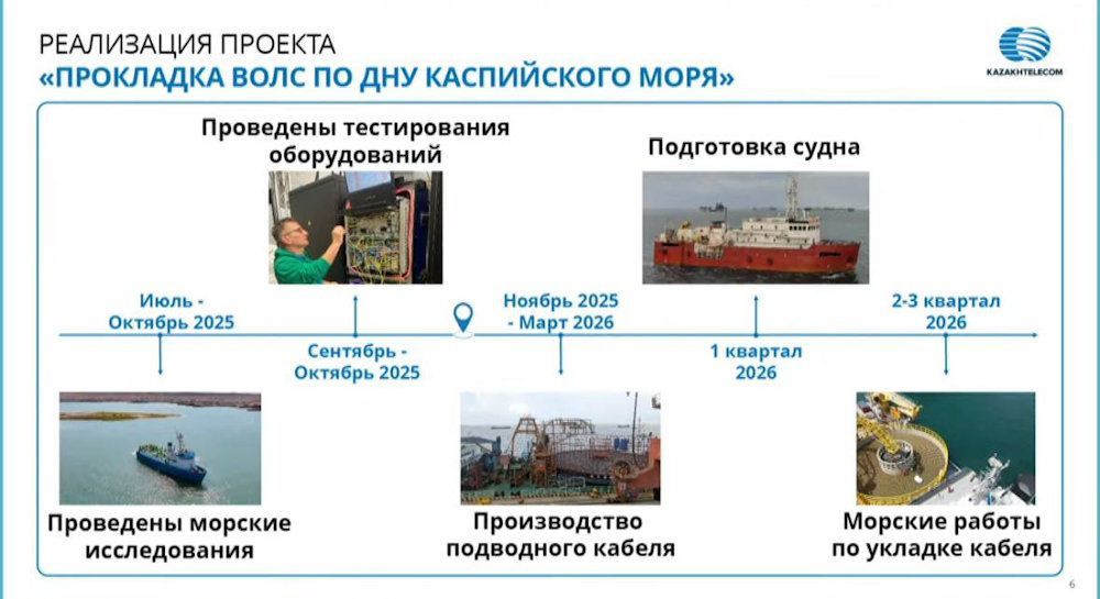 Оның айтуынша, 2025 жылдың шілде-қазан айлары аралығында теңізде зерттеу жұмыстары жүргізілген, ал 2025 жылдың қыркүйек-қазан айларында жабдықтар сынақтан өткен. Қарашада суасты кабелін өндіру жұмыстары басталып, 2026 жылдың мамырында аяқталады. Кабель төсеуге арналған кеме 2026 жылдың I тоқсанында дайындалады. Кабельді төсеу жұмыстары 2026 жылдың II-III тоқсандарында жүзеге асыру жоспарланған.