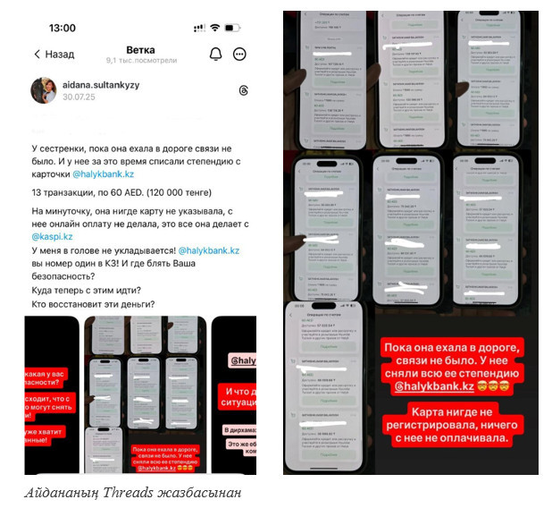 «Сіңлім студент болғандықтан, ауылға жиі барып тұрады. Сол күндердің бірінде Қордай-Алматы жолына шыққанда байланыс болмай қалды. Дəл осы уақытта оның шотынан белгісіз біреулер 13 транзакция жасап үлгерген. Ешқандай растау коды, тіпті 1414-тен СМС те келмеді. Карта деректерін ешқандай қосымшаға енгізген жоқ. Ештеңе анықталмады, банкке арыз жаздық. 45 жұмыс күні ішінде қаралады деді, жауап əлі жоқ», – деді Айдана.
