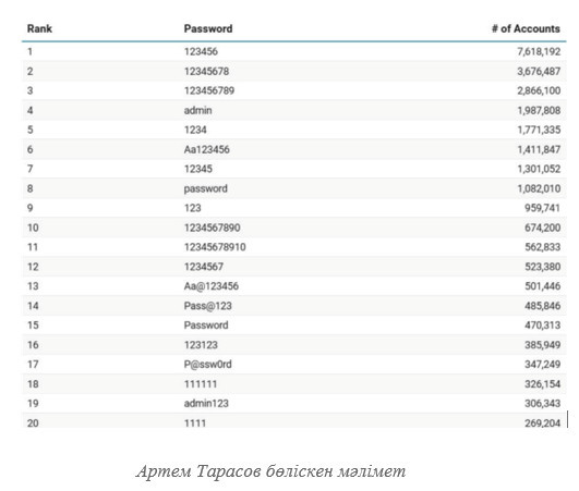 Маман деректерді ұрлаудың ең оңай жолы əлсіз құпиясөз екенін ескертеді. Биыл жазда жарияланған ашық статистикаға сəйкес, 8 миллион адам əлі күнге дейін «123456» сияқты оңай құпиясөзді қолданады.