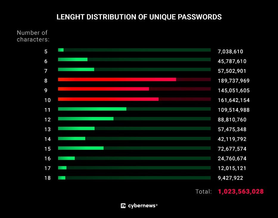 Бірегей құпиясөздердің таралуы бойынша Cybernews сайты жүргізген зерттеуге сəйкес, 189 миллионға жуық интернет қолданушылардың басым бөлігі əлі күнге дейін 8 таңбадан тұратын құпиясөзді таңдайды.