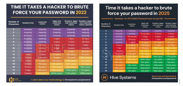 Hive Systems зерттеу компаниясының дерегінше, 2022 жылы 11 таңбалы құпиясөзді бұзу үшін хакерге шамамен 34 жыл қажет болған. Ал заманауи bcrypt əдісі құпиясөзді арнайы алгоритм арқылы бірнеше рет шифрлаудан өткізеді. 2025 жылғы есепке қарасақ, енді bcrypt-пен хакерге қорғалған құпиясөзді бұзуға 56 миллион жыл керек болады.