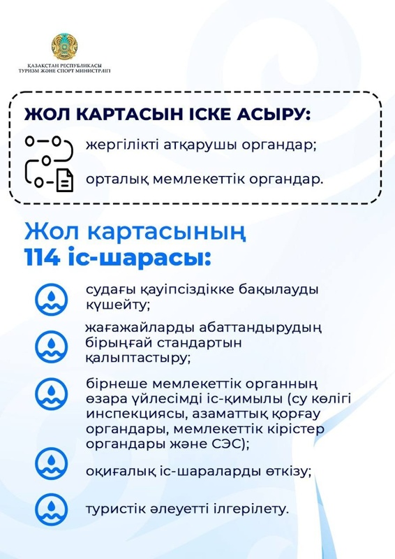 — Жол картасы 114 іс-шараны қамтиды. Оны іске асыру жергілікті атқарушы органдар мен орталық мемлекеттік органдардың бірлескен жұмысы арқылы жүзеге асырылады. Жол картасы аясында курортты өңірлердің көлік қолжетімділігін арттыру бойынша шаралар қабылданып жатыр. Жазғы маусымда туристік бағыттар бойынша теміржол рейстерінің саны көбейтіліп, қосымша пойыздар іске қосылады және вагондар саны арттырылады, — делінген министрлік таратқан ақпаратта.
