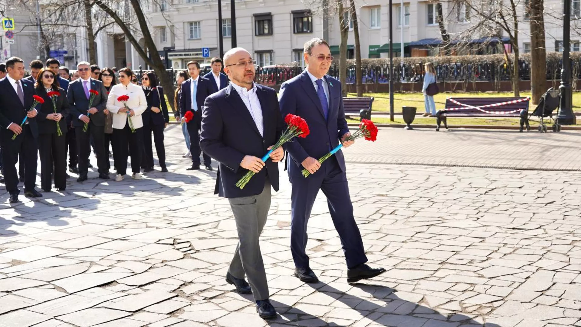 © Посольство Казахстана в РоссииВозложение цветов к памятнику Абаю в Москве